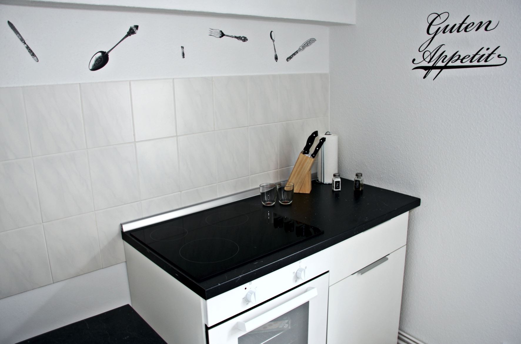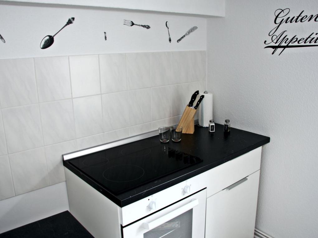 Küche mit Backofen, Kochfeld, Kühlschrank und Kochzubehör