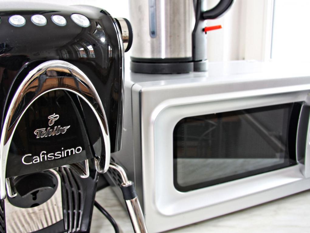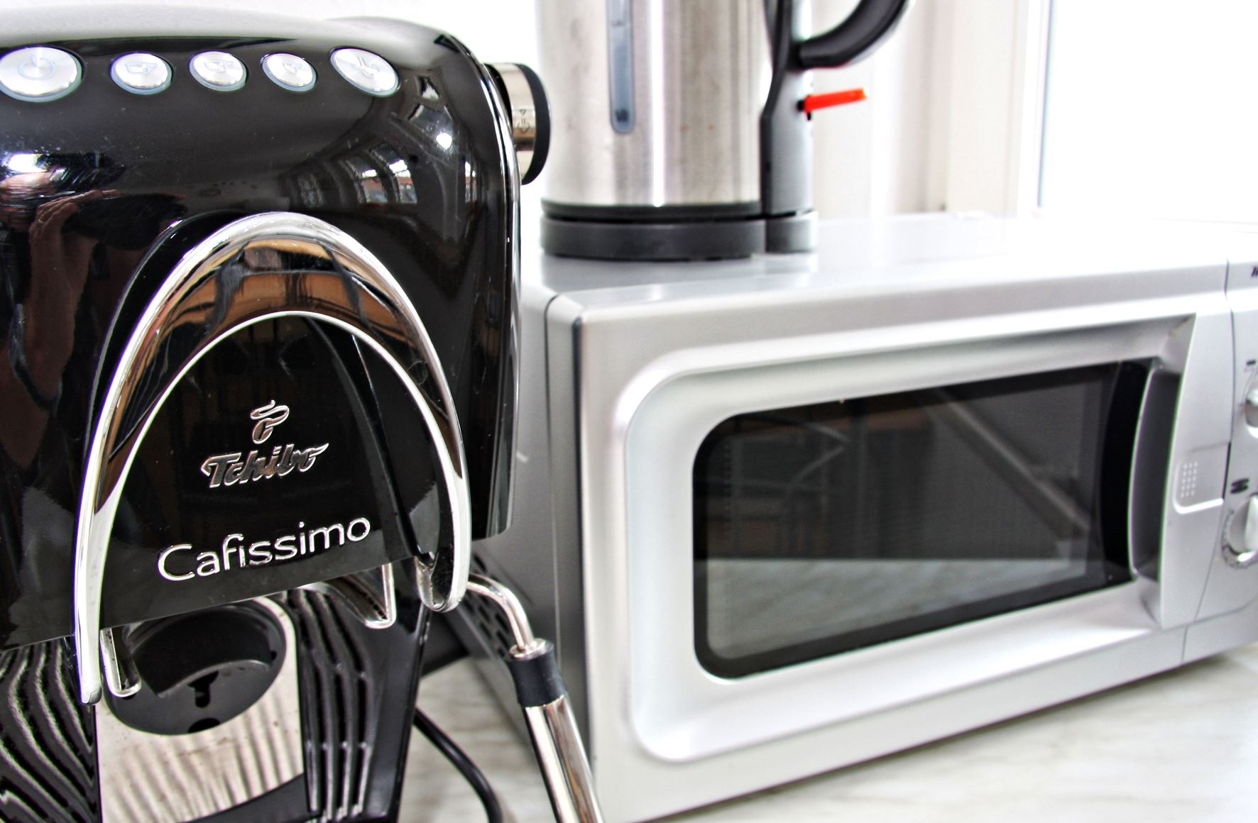 Küche mit Backofen, Kochfeld, Kühlschrank und Kochzubehör
