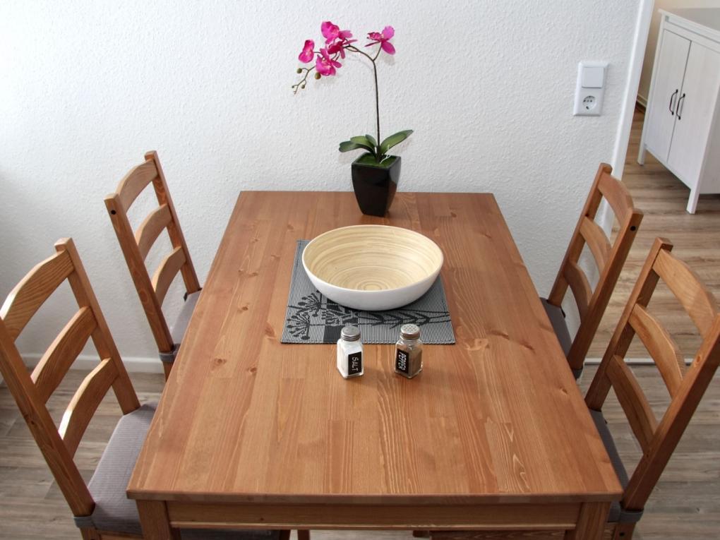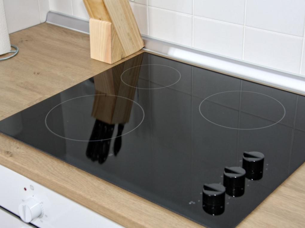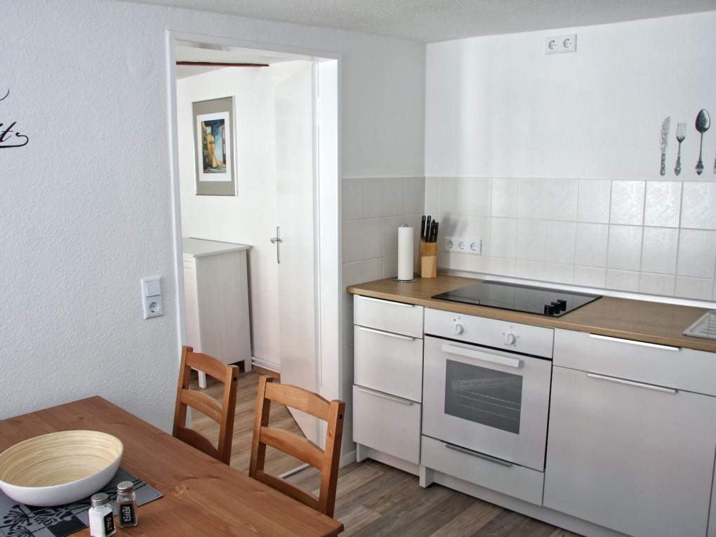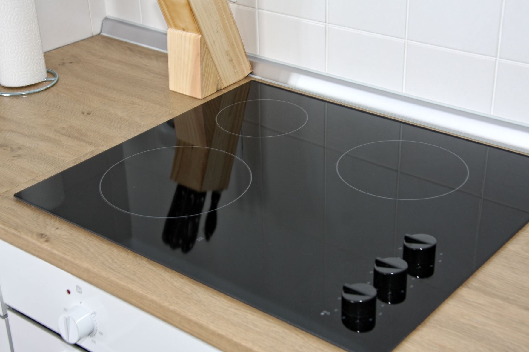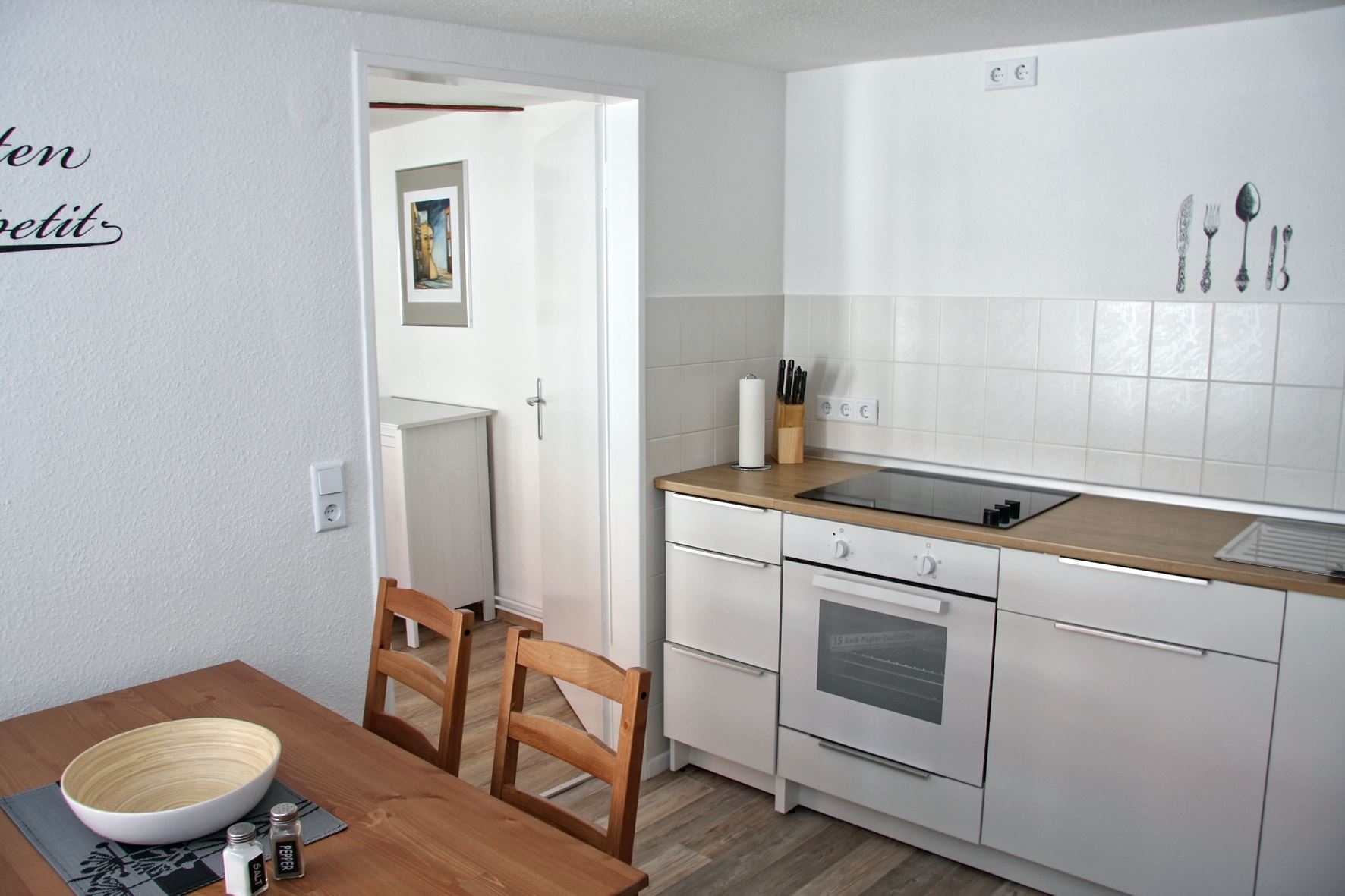 Küche mit Backofen, Kochfeld, Kühlschrank und Kochzubehör