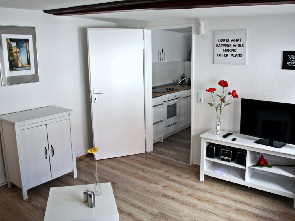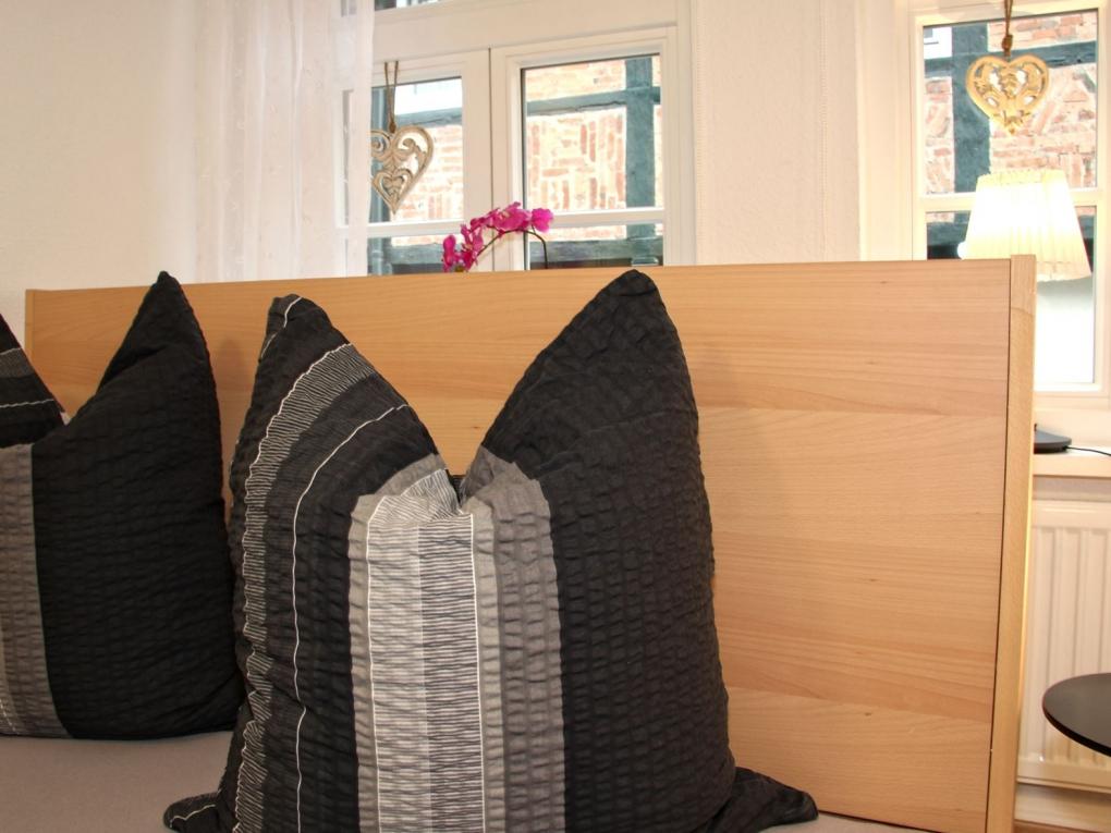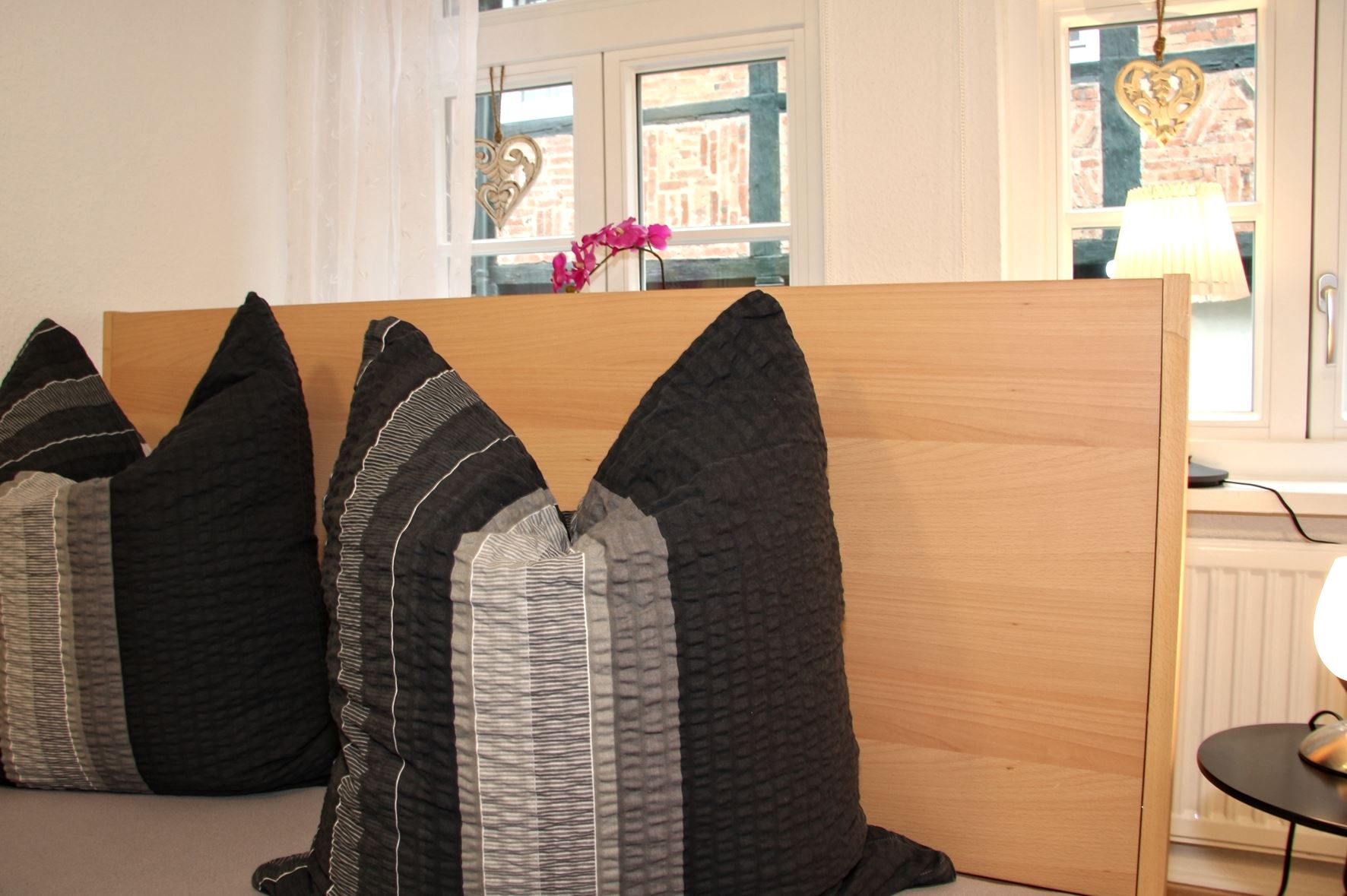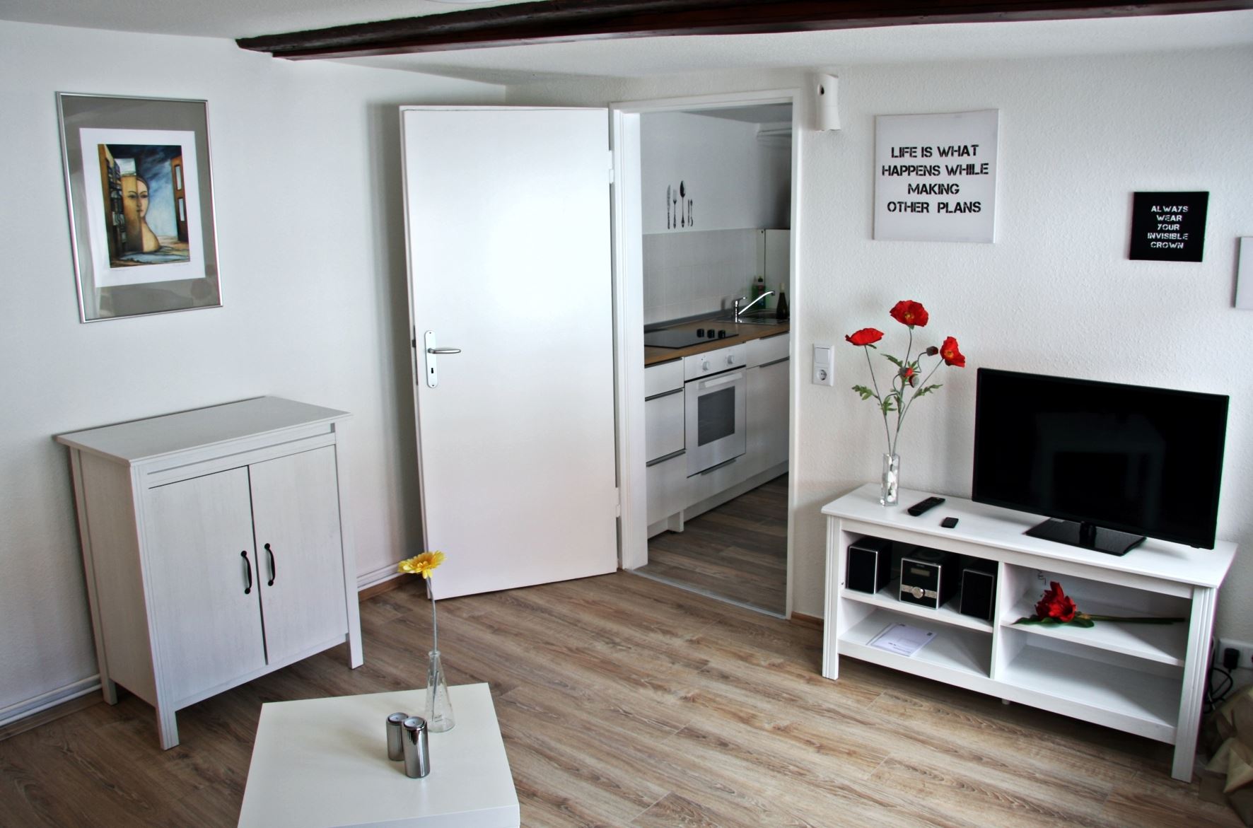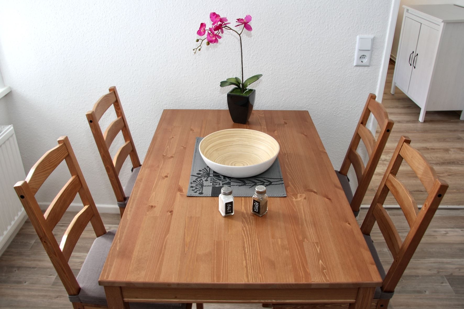 Küche mit Backofen, Kochfeld, Kühlschrank und Kochzubehör