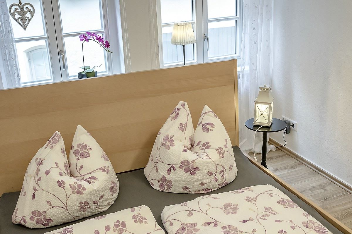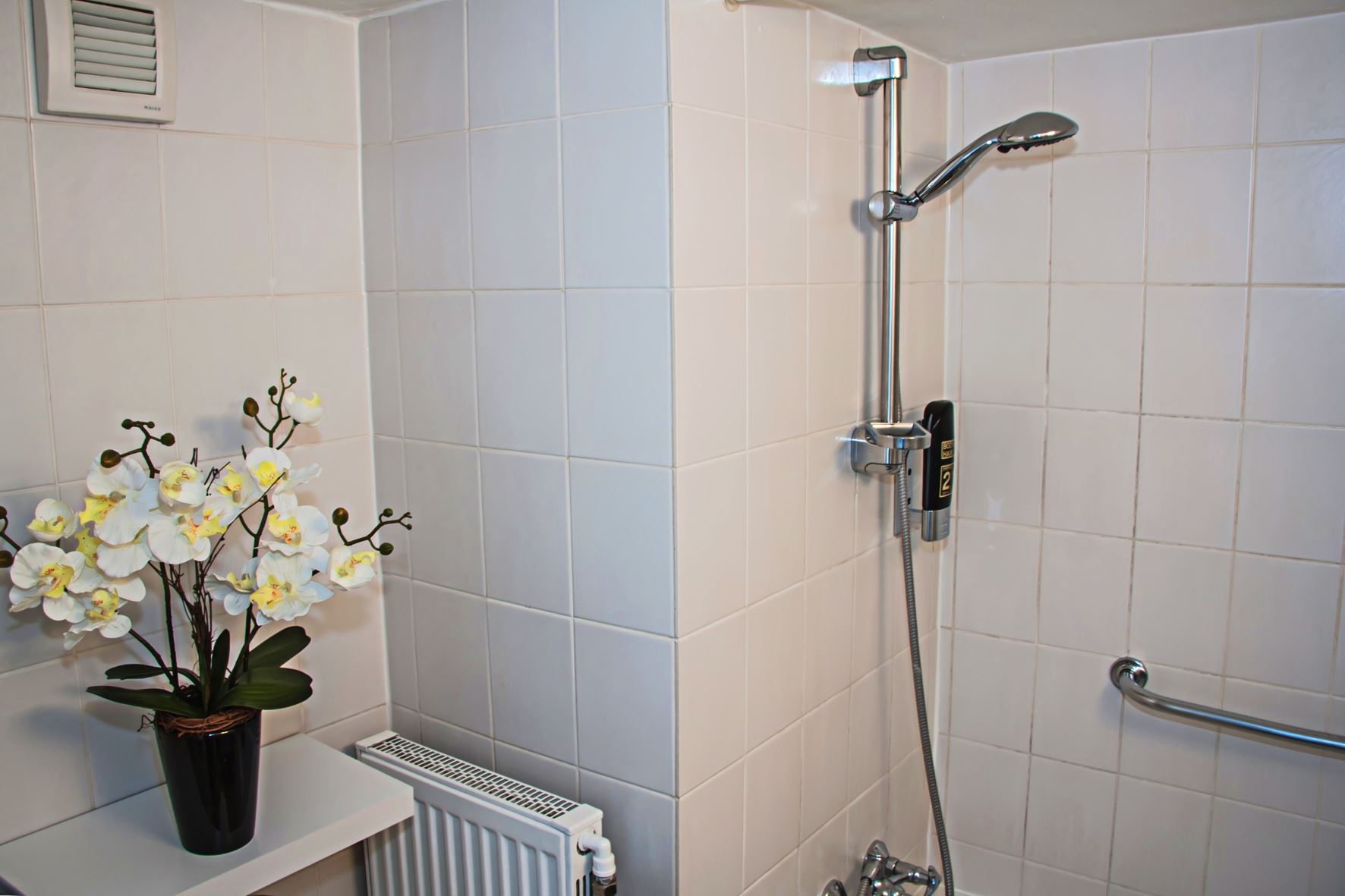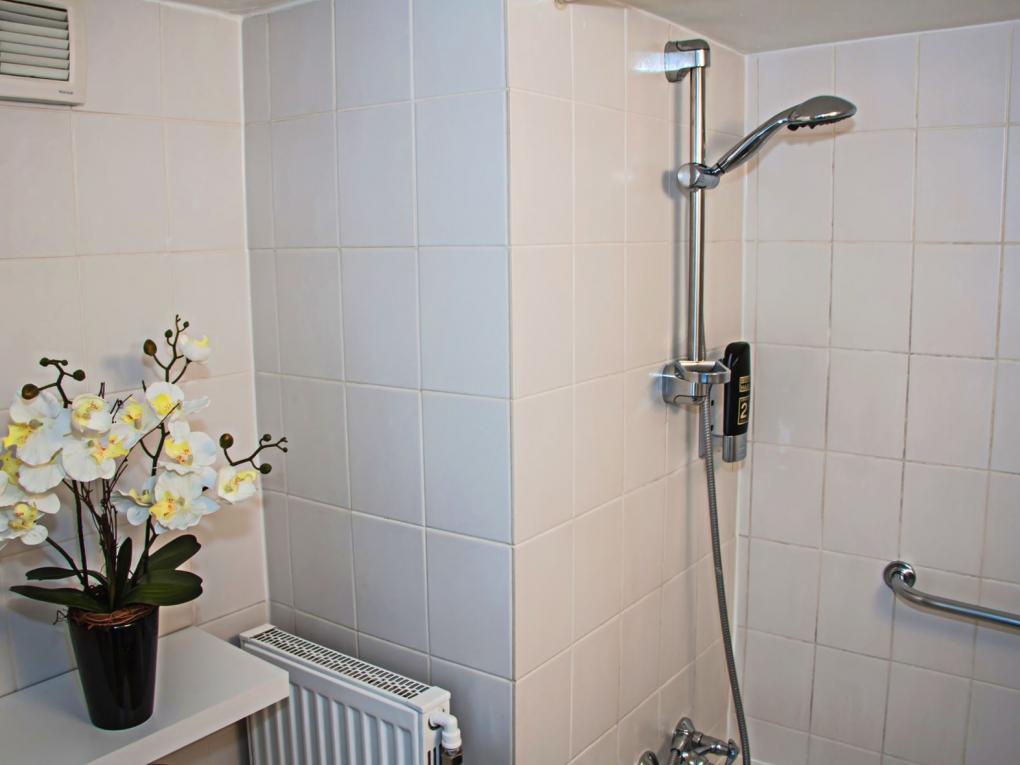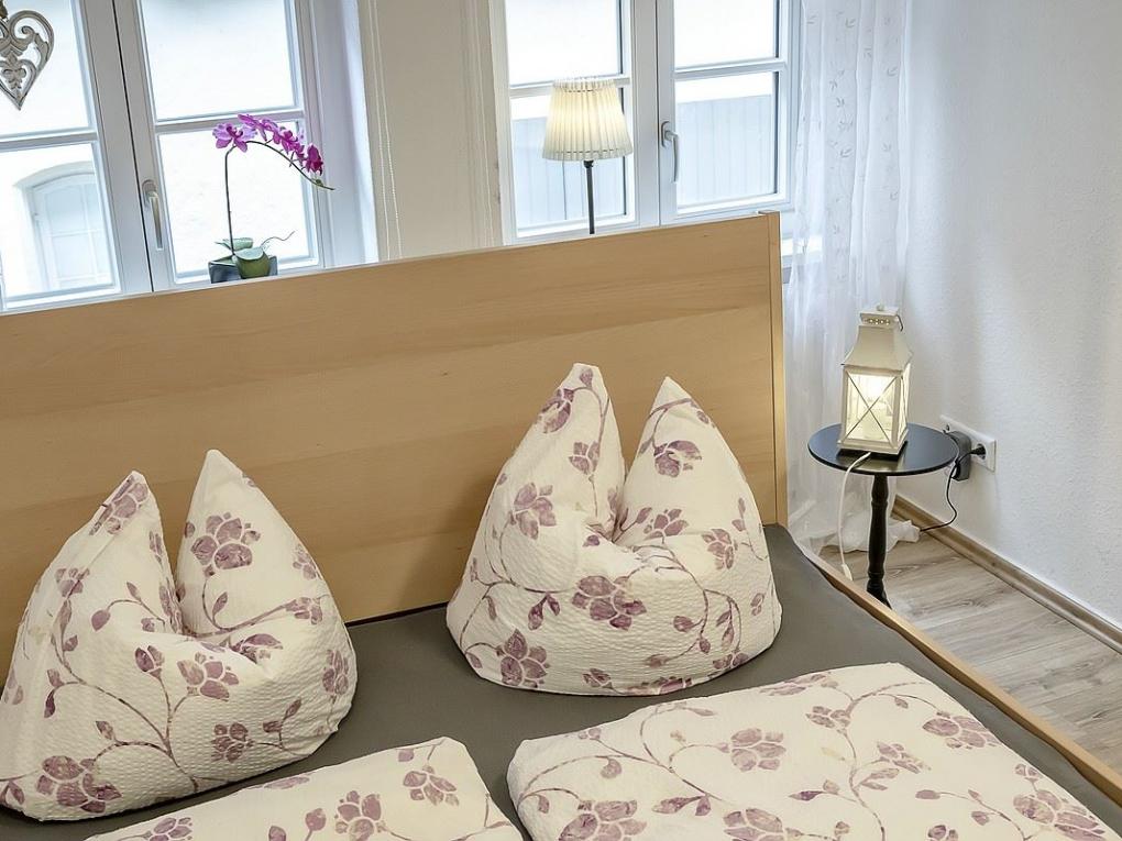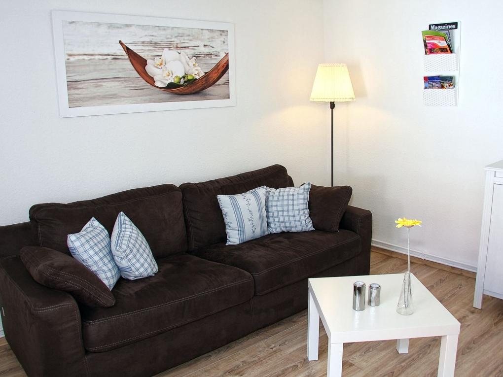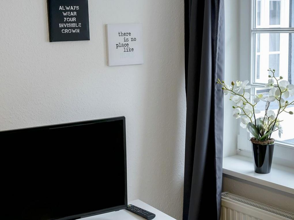 Küche mit Backofen, Kochfeld, Kühlschrank und Kochzubehör